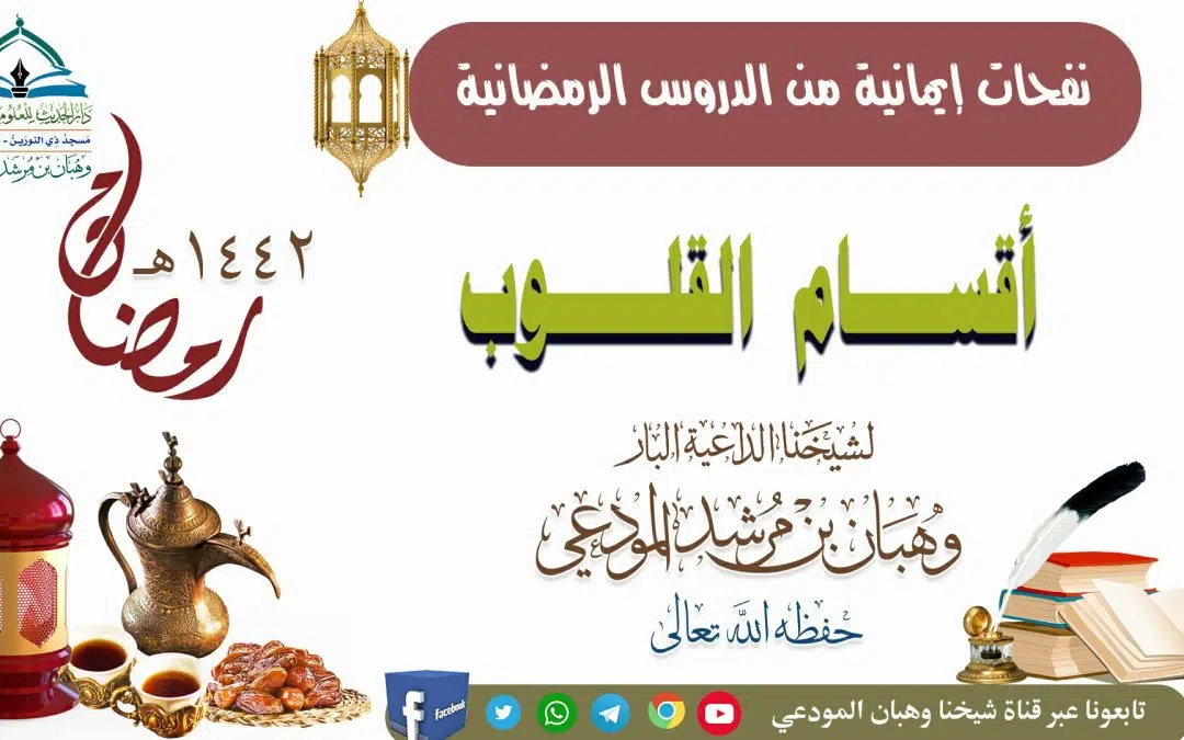 أقسام القلوب الأربعاء ۲۰ ذو القعدة ۱٤٤۲ هـ الموافق ۳۰ يونيو ۲۰۲۱ مـ | المحاضرات | شارك بتعليقك أقسام القلوب لشيخنا الداعية البار وهبان بن مرشد المودعي حفظه الله تعالى أُلقيت بدار الحديث للعلوم الشرعية بمسجد ذي النورين ـ اليمن ـ ذمار بتاريخ : 22 رمضان لعام 1442هـ PlayStop نافذة X مقالات ذات صلة فضل المداومة على ذكر الله تعالى نصائح وتوجيهات للمرأة المسلمة محاضرة أُلقيت للنساء إلى مسجد التوحيد ـ مدينة الروضة ـ محافظة شبوة أقسام القلوب اترك ردإلغاء الرد