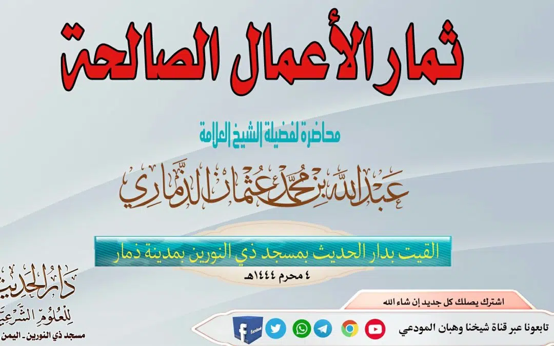 ثمار الأعمال الصالحة الثلاثاء ۱۸ محرم ۱٤٤٤ هـ الموافق ۱٦ أغسطس ۲۰۲۲ مـ | ضيوف الدار | شارك بتعليقك محاضرة لفضيلة الشيخ العلامة عبد الله بن عثمان الذماري حفظه الله تعالى أُلقيت بدار الحديث للعلوم الشرعية بمسجد ذي النورين ـ اليمن ـ ذمار بتاريخ : 4 محرم لعام 1444هـ PlayStop نافذة X مقالات ذات صلة محاضرة الشيخ الفاضل : عبد الكريم بن حسن الشيخ ، وأخيه الفاضل : عبد الرحمن بن حسن الشيخ حفظها الله فتح علام الغيوب بأسباب حياة القلوب | محاضرة الشيخ الفقيه محمد بن حزام الفضلي ثمار الأعمال الصالحة اترك ردإلغاء الرد