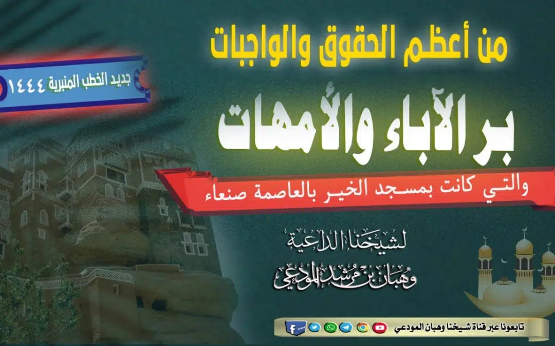 من أعظم الحقوق والواجبات بر الآباء الأمهات ـ خطبة بجامع الخير بصنعاء الخميس ۹ ربيع الثاني ۱٤٤٤ هـ الموافق ۳ نوفمبر ۲۰۲۲ مـ | الخطب | شارك بتعليقك من أعظم الحقوق والواجبات بر الآباء الأمهات خطبة لشيخنا الداعية وهبان بن مرشد المودعي حفظه الله تعالى أُلقيت بمسجد الخير ـ اليمن ـ صنعاء بتأريخ : 3 ربيع الآخر لعام 1444هـ PlayStop نافذة X مقالات ذات صلة الورود الزكية في ذكر بعض صفات رسولنا الخُلقية صلى الله عليه وسلم طريق النجاة في استغلال العمر في مرضات الله ( خطبة بدار الحديث بمعبر ) بر الآباء والأمهات اترك ردإلغاء الرد